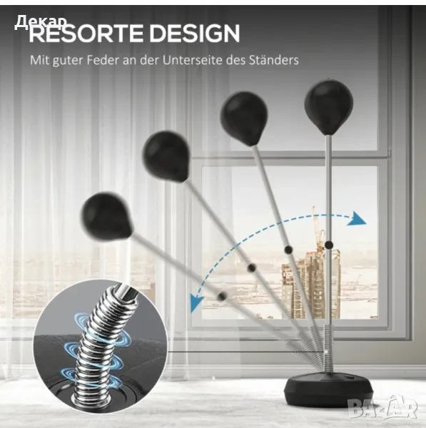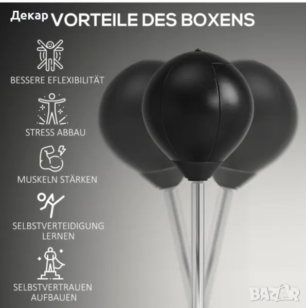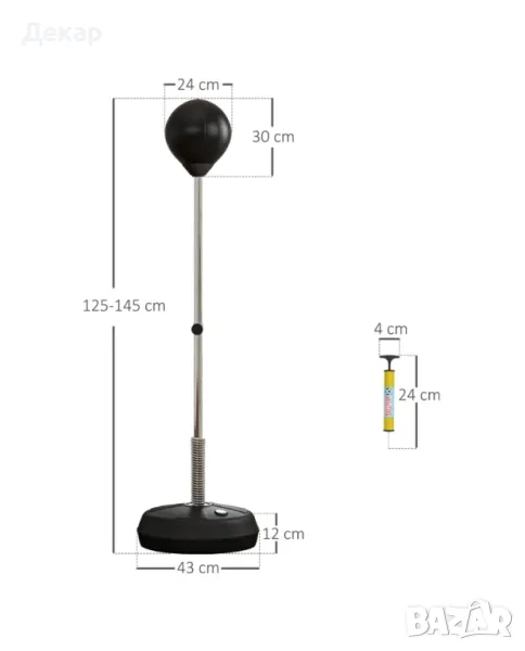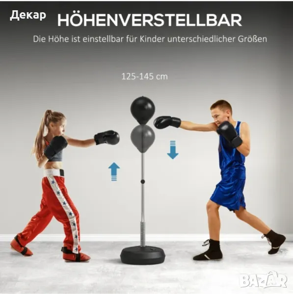 Продукта е с нарушена опаковка, мострен вкаран от чужбина Изживейте тренировките по бокс както никога досега – точно у дома! Нашият пълен комплект топки за удари е идеален за феновете на бокса и всеки, който иска да облекчи стреса. Иновативното окачване осигурява реалистични удари и симулира обучение на партньор. Основата може да се напълни с до 15 кг вода или 20 кг пясък, за да се осигури максимална стабилност. Вземете своя личен треньор по бокс и подобрете своята физическа форма и издръжливост – по всяко време и навсякъде!Описание:✔ Подходящ за тийнейджъри✔ Изпомпайте ударната топка от изкуствена кожа, готова за секунди✔ Основата може да се напълни с 15 кг вода или 20 кг пясък✔ Метален прът с пружина✔ Регулиране на височината по 4 различни начина✔ Може да се съхранява, за да спести място✔ Подходящ за професионална употреба както в студио, така и у дома✔ Лесно разглобяване и сглобяване✔ Включва боксови ръкавици и помпа✔ Внимание: Цветовете на продуктите (червено/черно/червено + черно) са на случаен принципТехнически данни:✔ Материал: изкуствена кожа, стомана, пластмаса✔ Цвят: черен✔ Тегло: 3 кг✔ Размери на пробивна топка: Ø24см х 30Н см✔ Височина: 125/131/138/145см✔ Размери на стойката: Ø43 x 12H смОбхват на доставка:✔ 1 x Стойка за ударна топка✔ 1 x Боксови ръкавици✔ 1 х помпа