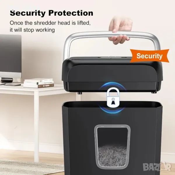 【Лесна работа и безопасна защита】 Функцията за автоматично стартиране/стоп и ръчно обръщане предпазва шредера за хартия от разочарование от засядане на хартия. Функцията за защита от прегряване се справя с проблемите при използване на шредера и удължава живота му. Шредерът за документи ще спре да работи, след като повдигнете главата, като ви предпазва.