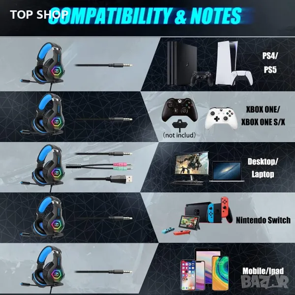 Съвместимост с множество платформи: Тези слушалки за игри с 3,5 мм аудио жак са съвместими с PS4, PS5, PC, Xbox One, Xbox One S/X, лаптопи, Mac, таблети, телефони. При включване към вашия PS4/PS5 не е необходима настройка, просто включете и изключете. USB жакът захранва само RGB светлините с електричество.