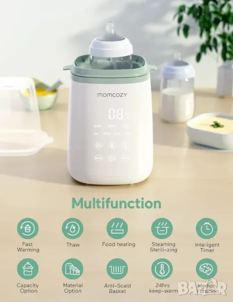 Momcozy: Бързо нагряване/затопляне на храна/варене на пара/размразяване/поддържане на топлина за 24 часа/избор на материал. Интелигентният нагревател за бутилки momcozy пасва на повечето типове бутилки и материали и загрява бебешките бутилки и бебешката храна безопасно и равномерно.