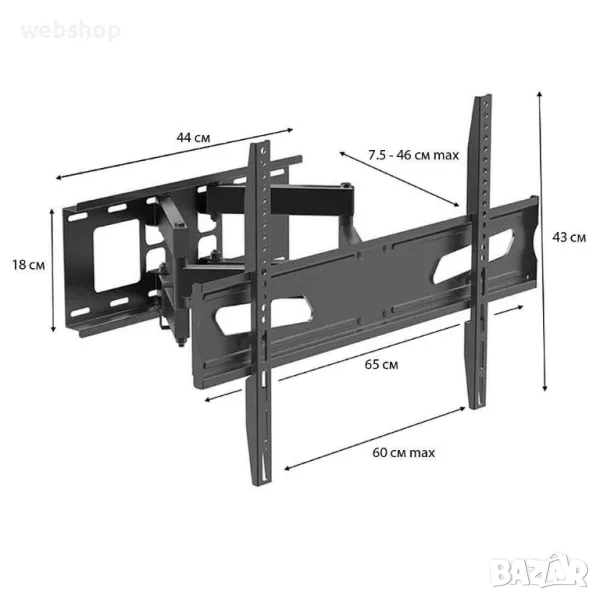 - Стойката е универсална за всички модели телевизори, шините се закрепят за VESA отворите