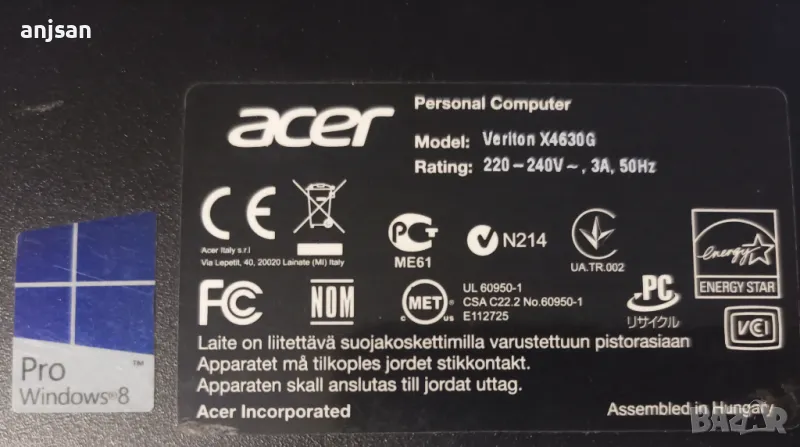 Продавам оригинален марков компютър Acer veriton . Компактен , тип SFF, работещ с всички необходими компоненти. Моделът може да се види на снимания етикет . Има инсталиран лицензиран Windows 8pro и може лесно и легално да се ъпдейтне до 10/11 . Един хард диск 160Gb ,процесор i3, памет 4х2Gb Ram , има USB-3 ,захранването е 80+ бронз .