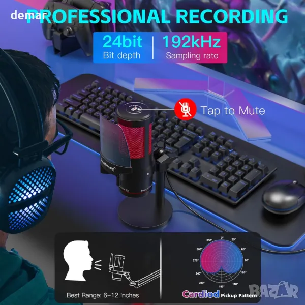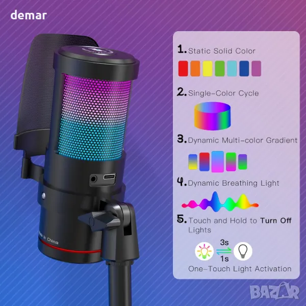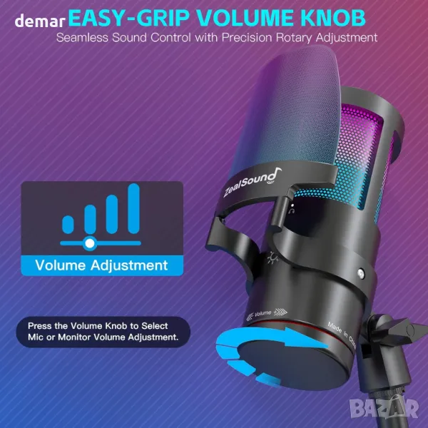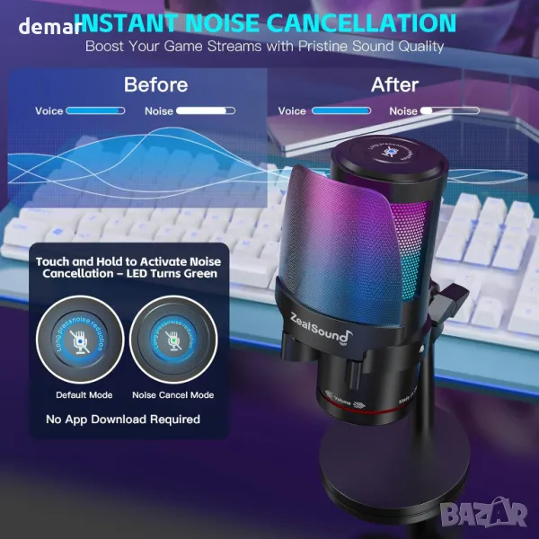 Геймърският микрофон Zealsound KM8 предлага активно шумопотискане за ясно, завладяващо изживяване с прост режим на превключване. Той разполага с висока честота на семплиране от 192 kHz и кардиоиден модел за прецизно улавяне на звука, идеален за игри, стрийминг и записи с професионално качество. Plug-and-play дизайнът осигурява съвместимост с персонални компютри, Mac, смартфони и конзоли за игри, използващи USB-C или светкавични адаптери, без да са необходими драйвери. Удобните контроли включват сензорен бутон за заглушаване с визуални индикатори, настройка на усилването и копче за сила на звука с двойна функция. Персонализирано RGB осветление с 10 режима добавя стил към всяка настройка, докато директното наблюдение на живо чрез 3,5 mm жак гарантира аудио без забавяне. В комплект със здрава стойка, поп филтър и разнообразни опции за свързване, този микрофон е идеален за създатели на съдържание на платформи като Twitch, YouTube или Zoom.