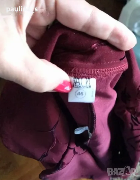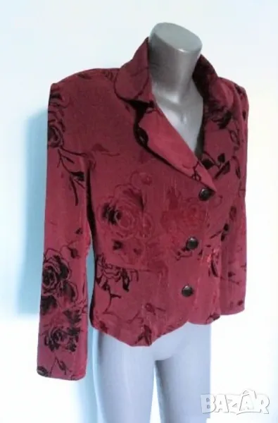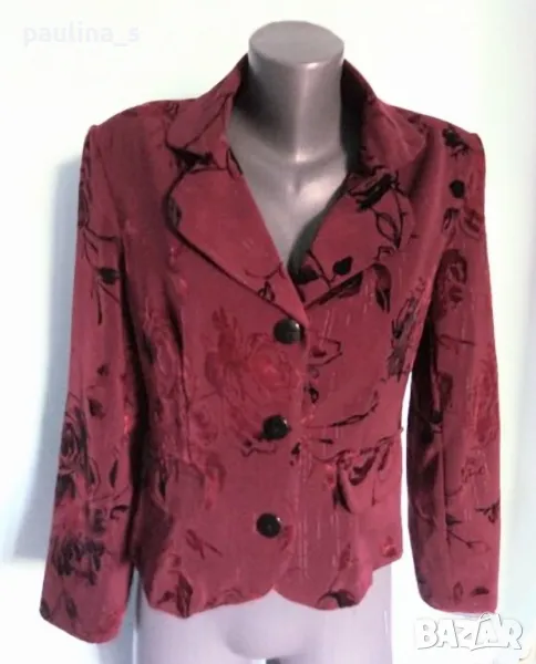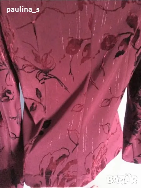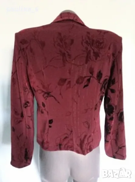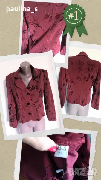 2️⃣. Колаж / L / 2XL - Луксозно сако за офис или повод "Аги"мода. Цената е крайна 24,99лв / 12,5 евро. Изключително стилно дамско сако в Бордо, червен. Платът има еластичност и покрива няколко размера. Той е ефектен с плюшен флорален принт и блестящи нишки, цветът е Бордо. Няма джобове, само на капаци е. Обличано е веднъж за повод, без следи от употреба, като ново.