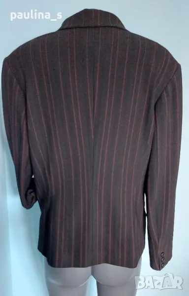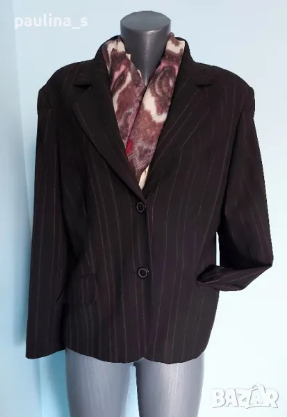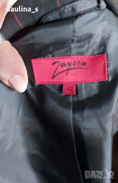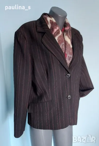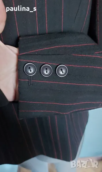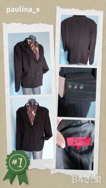1️⃣. Колаж / L / 2XL "Zagora". Цената е крайна 24,99лв / 12,5 евро. Стилно вталено сако с червени райета. Моделът е еднореден, джобовете са с капаци, платът е еластичен габардин. Покрива дрескода за офис. Като ново, без дефекти и етикет.