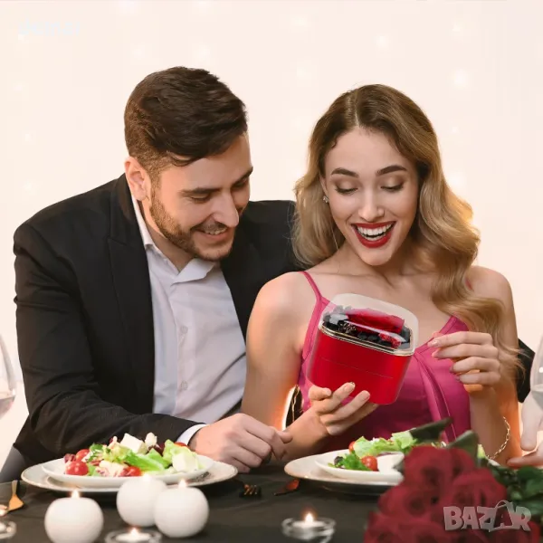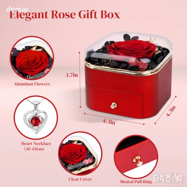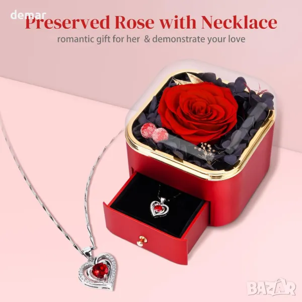 Вечен подаръчен комплект, включващ запазена роза, която издържа 3-5 години без поддръжка, символизираща вечната любов, съчетана с елегантна огърлица, украсена с искрящ диамант. Здравата кутия за бижута не само защитава огърлицата, но служи и като място за съхранение на други малки бижута. Перфектен за декориране на всяко пространство, този комплект е идеален за поводи като Ден на майката, Свети Валентин, рождени дни, годишнини или Коледа, предлагайки искрен и смислен израз на любов и признателност.
