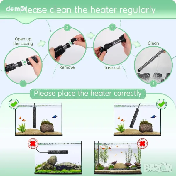 Нагревателят за аквариуми AQQA разполага с високоефективни кварцови стъклени тръби и материал от силициев карбид за бързо и безопасно нагряване, с издръжлив ABS пластмасов капак, устойчив на топлина и корозия. Неговият външен контролер с двоен дисплей осигурява точно следене на температурата. Функциите за безопасност включват автоматично изключване, когато нагревателят е без вода или температурата на водата надвиши 95°F (35°C), с кодове за грешки за лесно отстраняване на неизправности. Изисква редовно почистване на всеки 1-2 седмици и трябва да се използва със система за циркулация на вода за оптимална работа. Винаги проверявайте за пукнатини преди употреба и избягвайте заравянето на нагревателя.