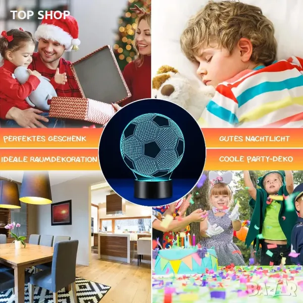 Футболна 3D LED нощна лампа: Ще получите футболен образ с тази нощна лампа, която използва технология за 3D осветление, за да проектира изображение върху акрилна плоча, прикрепена към основата. В допълнение към показването на една футболна топка наведнъж, можете също да избирате от 16 цвята с помощта на дистанционно управление, което ви позволява да затъмнявате или осветявате изображението. Работи с три АА батерии (не са включени), но можете да го захраните и с USB кабела в комплекта.