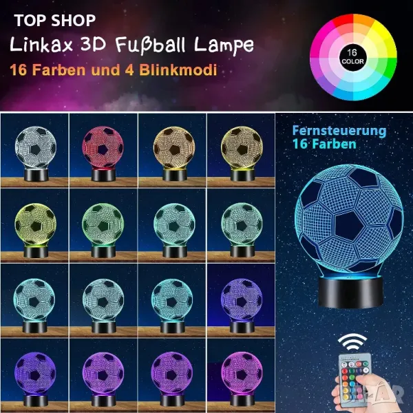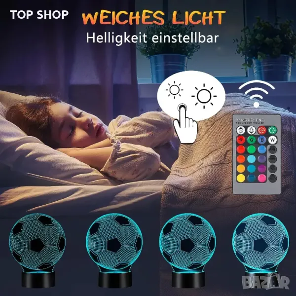 7 ПРОМЕНИ НА ЦВЕТА ИЛИ 16 ПРОМЕНИ НА ЦВЕТА - Тази футболна нощна лампа ви позволява да избирате от един от седем различни цвята. Цветът ще се променя между тези 7 цвята с всяко докосване на основата с пръст. 16 цветови режима с дистанционно управление. Илюзията за 3D изображение върху акрилна чиния с футболна топка осигурява страхотна и забавна алтернатива на традиционните нощни светлини.