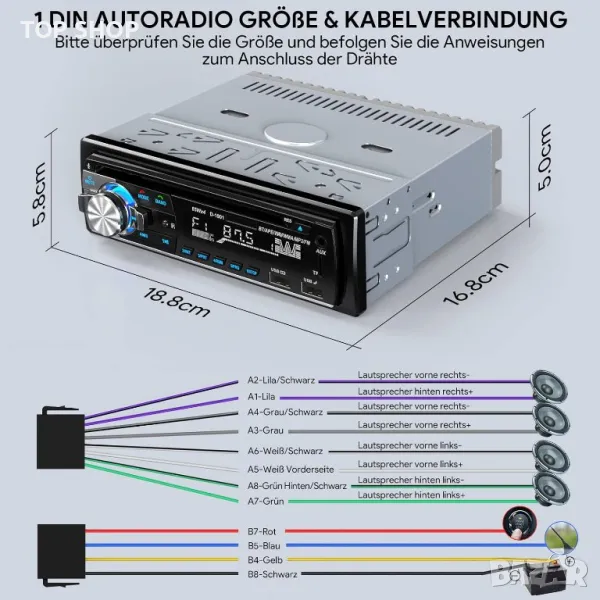 [1 Din радио за кола с 2 USB порта] Размер: 18,8 cm x 16,8 cm x 5,0 cm, подходящо за стандартна централна конзола с един din, за 12V превозни средства. 2 USB порта за зареждане и възпроизвеждане на музика. Един порт за зареждане, мобилно устройство зарежда 50% по-бързо, поддържа Android и iOS устройства. MP3 плейърът на автомобилното радио поддържа MP3 / WMA / WAV / FLAC аудио формати. Музиката може да се възпроизвежда и чрез AUX/TF карта.