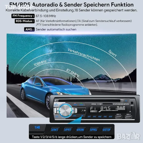 RDS радио за кола с Bluetooth комплект за свободни ръце: радио за кола Bluetooth версия 5.0, вграден висококачествен микрофон за по-бърза и ясна функция за свободни ръце. Радиото за кола 1 DIN поддържа устройства с Android и iOS. Натиснете продължително бутона за сила на звука, за да отворите менюто за настройка на RDS, и натиснете кратко бутона за сила на звука, за да изберете функцията в AF / TA / PTY.