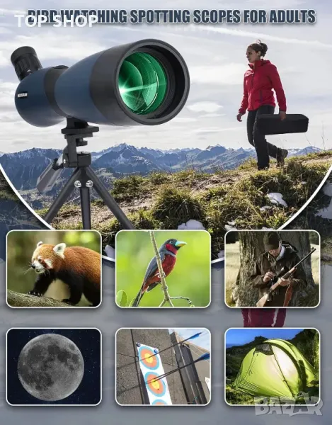 Мощен бинокъл 25-75 x 70: Регулируемо увеличение от 25 до 75 x и система за динамично фокусиране от 80 mm за големи лещи на обектива, което ви позволява лесно да увеличите целта си. Ергономичният дизайн на окуляра се накланя на 45 градуса, осигурява по-удобно гледане и ви доближава до красив природен пейзаж. Перфектен за стрелба по мишена, стрелба с лък, лов, наблюдение на птици, животни, туризъм, къмпинг, пейзаж, спорт на открито, астрономически наблюдения и др.
