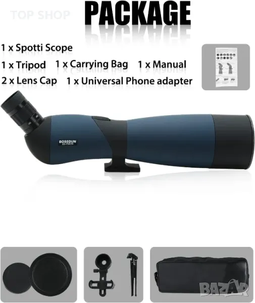 Стъклото с призма BAK4 осигурява по-добра яркост и контраст на изображението. Окулярът с регулируемо увеличение позволява увеличения от 25X до 75X. Многослойните оптични лещи със зелен филм осигуряват по-ясни и по-ярки изгледи. Прибиращата се капачка на обектива осигурява отлична защита срещу вода и мъгла. Телескопът Spektive се доставя с много професионални аксесоари. Удобен за вас да правите ярки и прекрасни снимки.