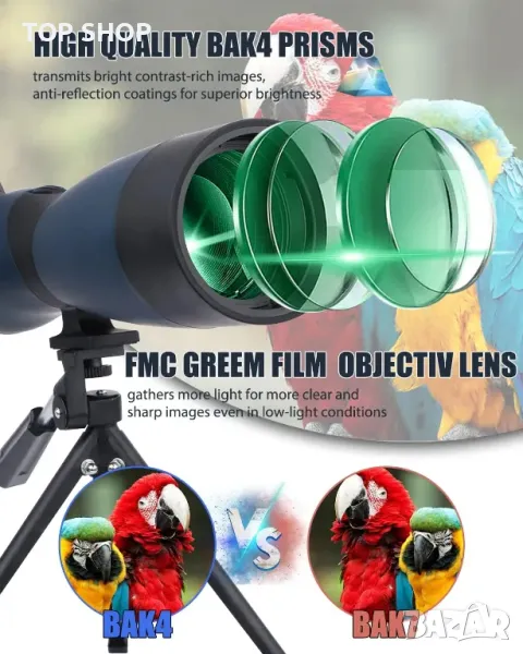 Висококачествената призма BAK4 елиминира отраженията, увеличава пропускането на светлина и гарантира ярки и контрастни изображения, дори при слаба светлина.