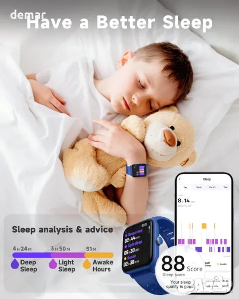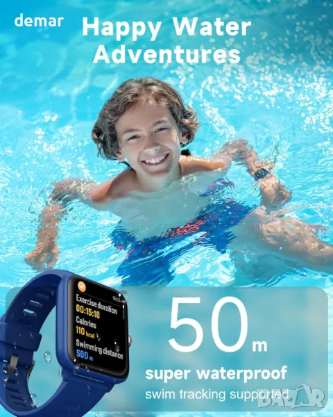BIGGERFIVE Смарт часовник за деца, крачкомер, сърдечен ритъм, 5ATM водоустойчив, монитор за сън, син