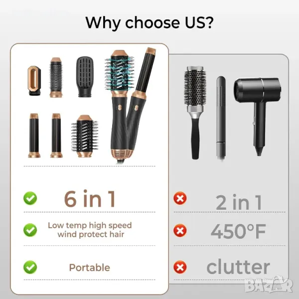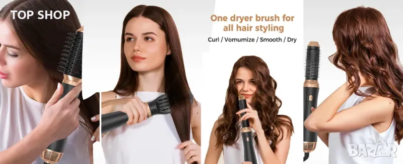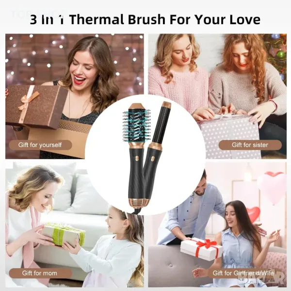 Нова надстройка 6 в 1 Четка за сешоар: Комплектът четки за сешоар за жени се предлага с 6 сменяеми приставки за четки, 1* глава за сешоар, 1* четка за преса за коса, 2* въздушна маша, 1* четка с горещ въздух за обем, 1* термо четка. Четка за сешоар Четка за сешоар в едно, тази четка за сешоар осигурява идеалното средство за създаване на различни прически за различни дължини на косата. Изящната опаковка също ви позволява да го използвате като подарък за приятели, семейство или някой друг, когото обичате.