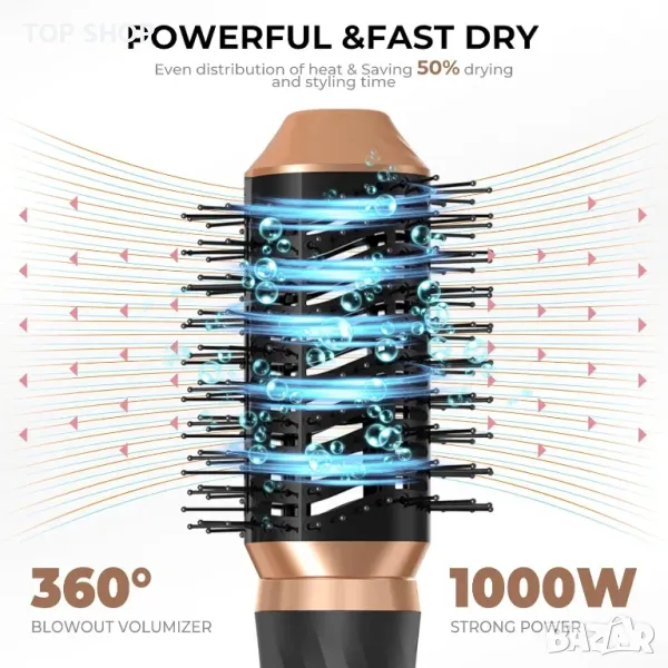 Технология с отрицателни йони и керамично покритие: Нашият комплект четки за сешоар с четка за оформяне на коса използва технология с отрицателни йони, която може да освободи отрицателни йони на 360°, издухващата четка намалява къдренето и статичното електричество, намалява щетите и в същото време по-добре поддържа косата ви; Керамичното покритие насища въздушния поток, разпределя топлината равномерно, прониква бързо в косата, сешоарът с четка ускорява сушенето отвътре навън, за да ви помогне да създадете здрава коса.