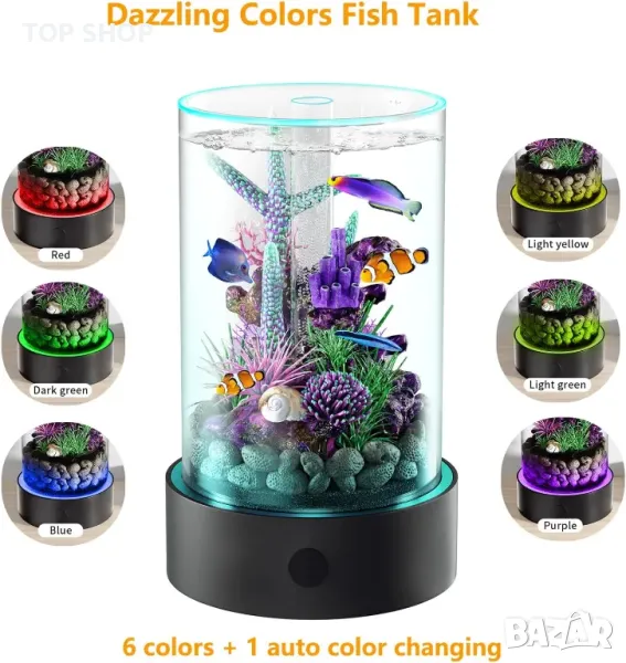 【Регулируемо многоцветно LED осветление】: Вградена светодиодна светлина в основата на аквариума със златна рибка, просто докоснете дъното, можете да избирате от спектър от цветове, за да подобрите красотата на вашите водни домашни любимци. Тиха въздушна помпа, без шум. Този аквариум за