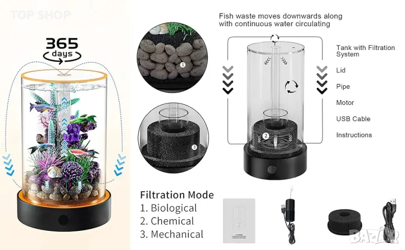 【Безпроблемна технология за самопочистване】: Край на ежедневната смяна на водата! Нашият комплект за мини аквариум разполага с усъвършенствана патентована самопочистваща се филтърна система. Водата се изтегля от дъното и циркулира нагоре, като същевременно разгражда и пречиства вредните вещества от рибните екскременти, оставяйки вашите риби винаги да живеят на свобода в свеж и кристално чист резервоар