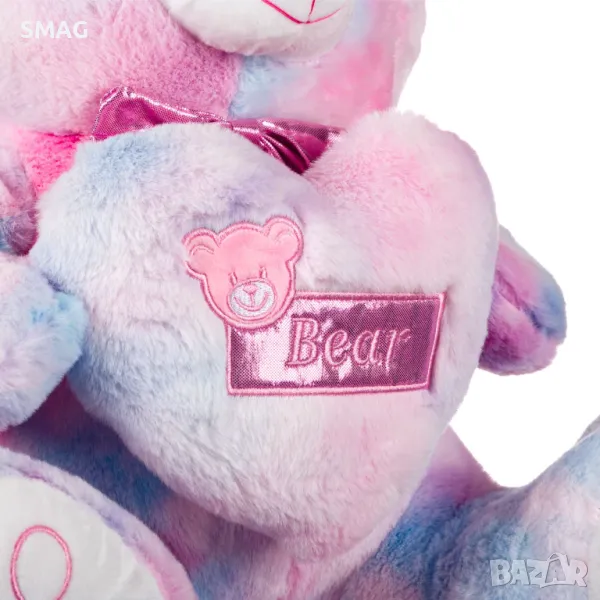 Седящо плюшено мече в розови нюанси с папийонка, детайли от foil по лапите и бродирано розово сърце – чудесен подарък за Свети Валентин или любим човек. Голямо и меко, подходящо за прегръдки и декоративен акцент. Симпатично и нежно, носи радост и усмивки на получателя.