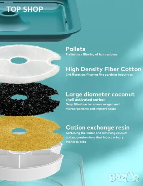 ? 【Четворна система за филтриране】 Котешкият фонтан е направен от памук с висока плътност, кокосови черупки, активен въглен и йонообменна смола. Може да филтрира примесите, да премахне специфичната миризма, да омекоти качеството на водата и да подобри вкуса. Можете да осигурите на вашия домашен любимец по-прясна и чиста вода, за да го предпазите от заболяване.