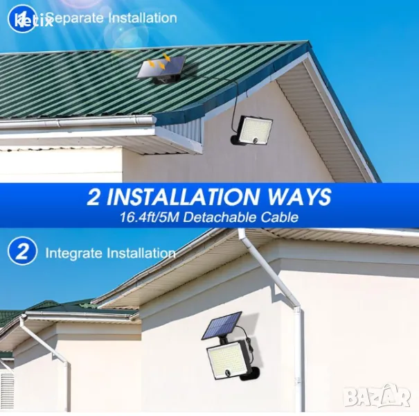- Лесен монтаж за вътрешна и външна употреба: кабелът на този LED соларен прожектор на открито е дълъг 5 метра и препоръчителната височина за монтаж е около 2-3 метра. Можете лесно да монтирате слънчевата външна лампа на стената с помощта на включените винтове, без да имате нужда от допълнителни външни източници на захранване. И слънчевият панел, и корпусът на лампата могат да се инсталират отделно, което позволява употреба на закрито и на открито.