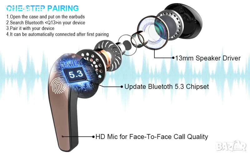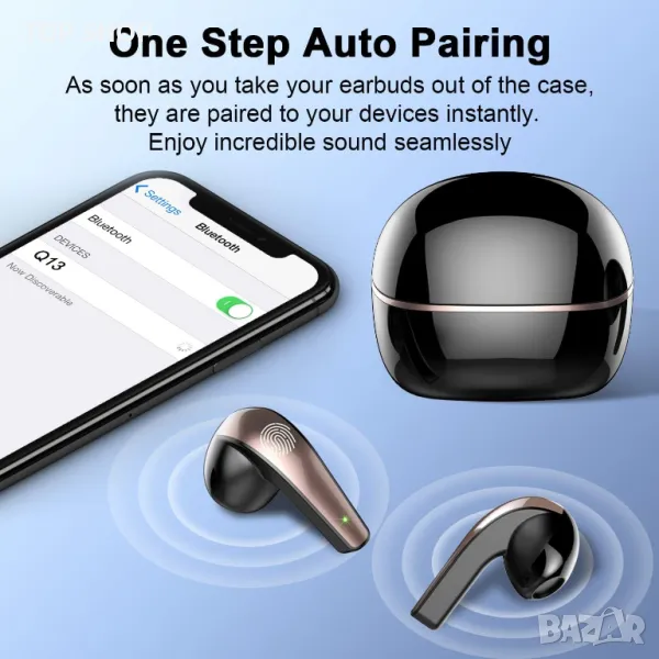 Bluetooth 5.3 безпроблемно сдвояване: Bluetooth слушалките Q13 се отличават с усъвършенстваната технология Bluetooth 5.3, поддържат HSP HFP A2DP AVRCP, което осигурява незабавно сдвояване и стабилно предаване без прекъсвания. Тези bluetooth слушалки ще се сдвоят незабавно, след като бъдат извадени от кутията за зареждане и автоматично ще се свържат с последно сдвоеното устройство.