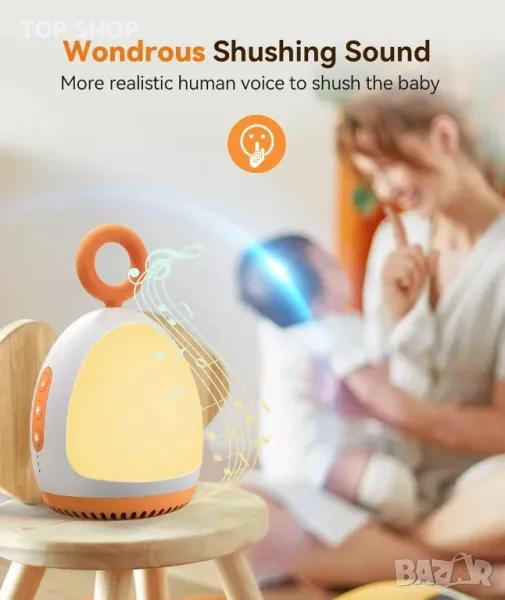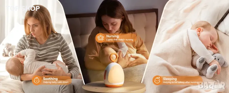 Нощна лампа за кърмене: Машината за шум на бебето има отделна подобрена нощна лампа за нощно хранене и смяна на пелените, без да се налага да избирате специална нощна лампа за бебето и топла нощна лампа за защита на очите на бебето. (Забележка: Натиснете и задръжте бутона за осветление, за да регулирате яркостта)