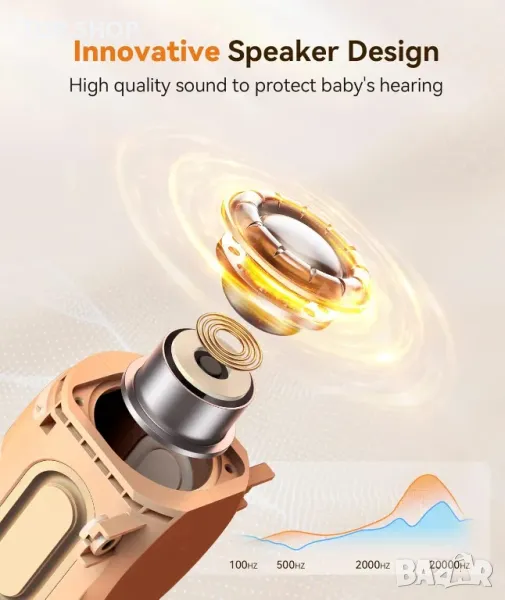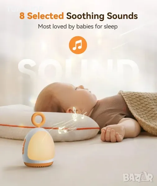 8 успокояващи звука: Машината с бял шум разполага с 8 любими на бебето успокояващи звука: истински човешки звук на шум, фетален тон (сърцебиене), сешоар, бял шум, приспивна песен на Брам, музикална кутия, океански прибой и поток. Всички звуци, които не се повтарят, помагат да успокоите вашите капризни малки и да спят по-добре.