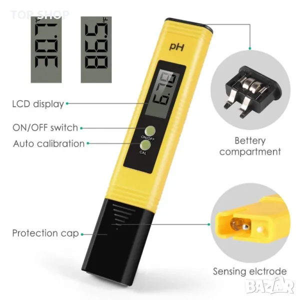 Автоматична компенсация на температурата]Тестерът за pH има функция ATC, така че може да се регулира според температурата на водата, за да даде показания за pH почти мигновено.