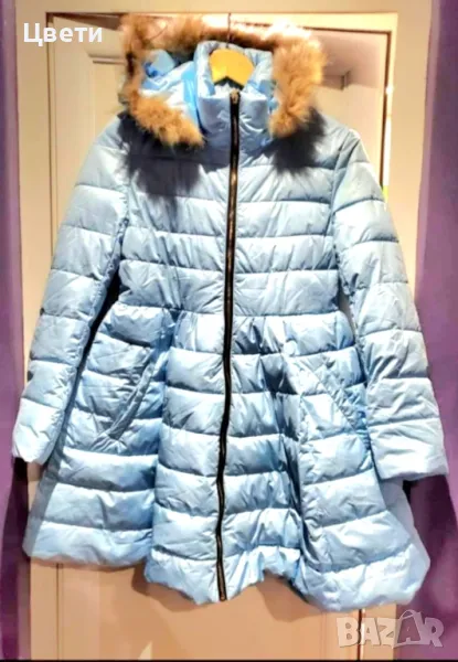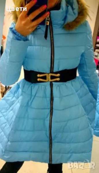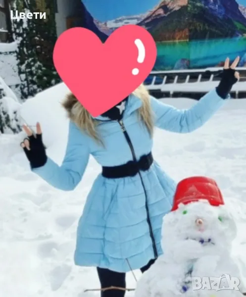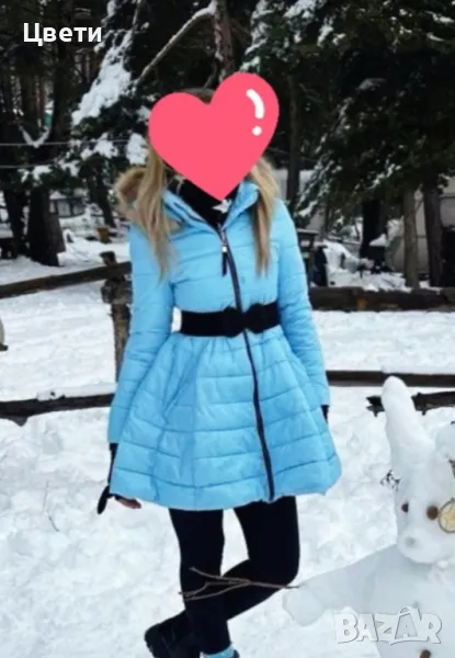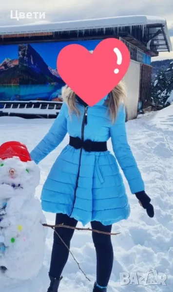 Дамско кукленско яке в страхотен син цвят. Модела е разкроен. Размер М. Качулката се сваля, има джобове. Без колан. Обличано е 1 път.