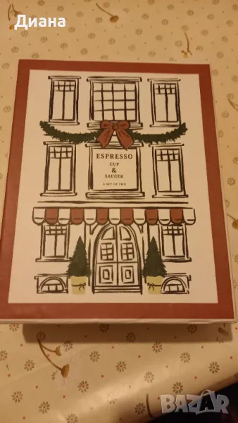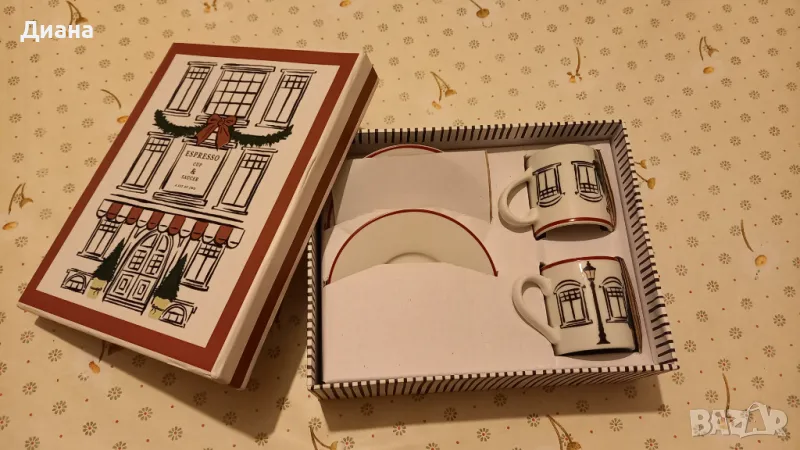 Неизползван сет от две чашки за кафе с чинийки, изчистен коледен мотив, в подаръчна кутия.