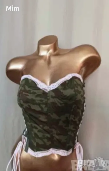 Корсет от еластичен прозрачен тюл отзад закопчаването е с телени закопчалки по цялата дължина, отпред камуфлаж, странично със розов шнур за регулиране на размера по тялото, с два отвесни банели, подгръдна от 80 до 100 см ,дължина 30 см Няма забележки.