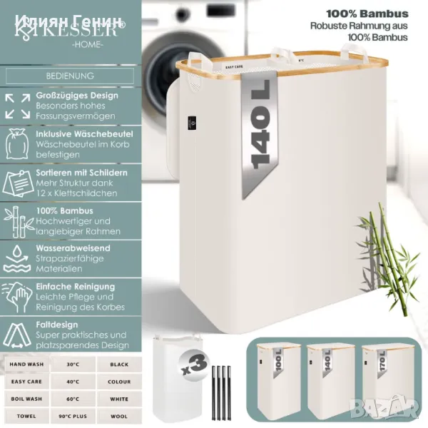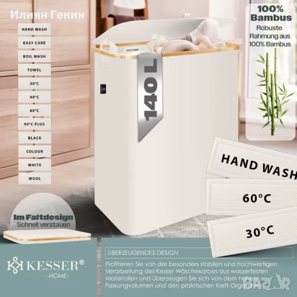 Високо качество :: Рамката на коша за пране Kesser е изработена от 100% висококачествен бамбук, устойчив и екологичен материал, който не само придава елегантна естетика, но също така осигурява изключителна дълготрайност. Водоотблъскващите материали гарантират допълнителна издръжливост и правят коша изключително устойчив на влага.
