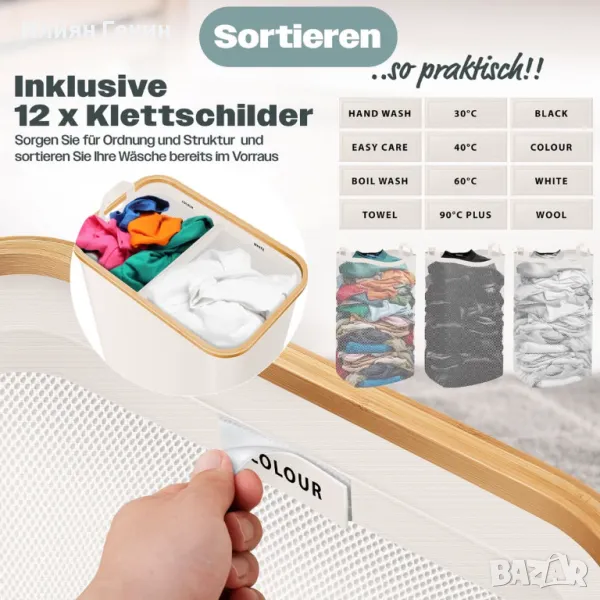 Включените 12 велкро етикета революционизират организацията на вашето пране. Можете да сортирате прането си предварително, като избягвате досадното търсене и сортиране преди пране. Благодарение на този иновативен метод вие винаги следите прането си и можете да перете по целенасочен и ефективен начин.