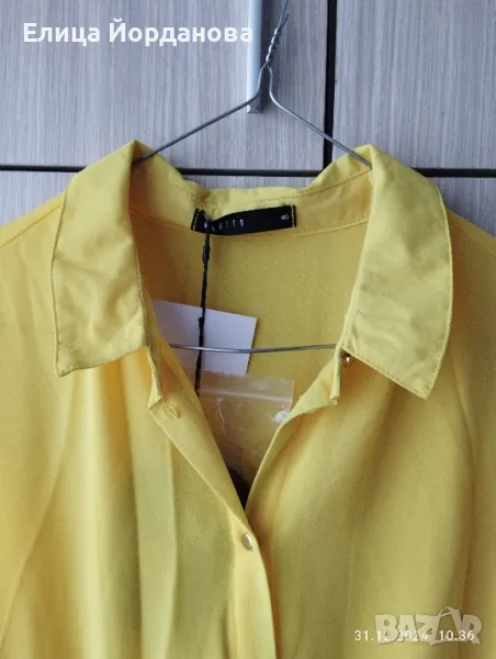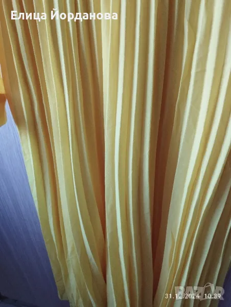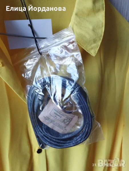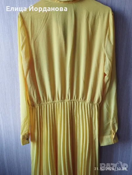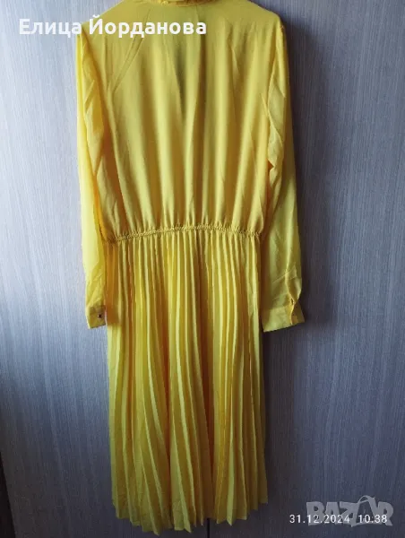 Чисто нова жълта рокля на Мохито. Снабдена с кожен колан към нея. Роклята е с дълъг ръкав, ластик в кръста,което позволява разтягане настрани. Надолу е солей,отгоре е изчистена.Има подплата и не прозира. Подходяща за всички сезони без зимата. Размер 40 по европейската номерация,което съответства на XL. Гръдна обиколка около 100 см.