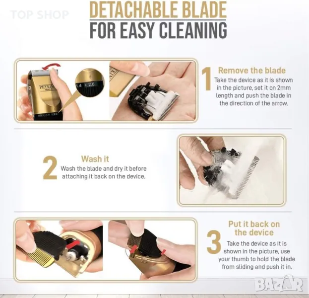 Остър и безопасен нож за подстригване: Машинките за подстригване на домашни любимци са проектирани с фиксирано острие от неръждаема стомана и керамично подвижно острие за прецизно подстригване, заедно с мощния мотор осигуряват отлично подстригване без закачане и бързо отстраняване на космите. Острието е достатъчно остро дори след продължителна употреба и гарантира висока издръжливост. Разглобяеми остриета за лесна смяна и почистване: Регулирайте настройката на яката на 2 mm, след това задръжте острието и натиснете надолу.