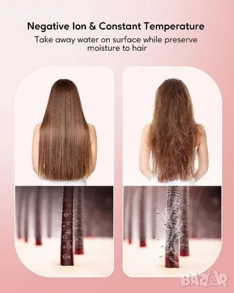 Отрицателни йони за задържане на влага. Този професионален сешоар излъчва силно концентрирани отрицателни йони от 6000 W/cm3 по време на сешоар. Те взаимодействат с H2O молекулите и ги раздробяват на по-малки частици. По този начин водата се изпарява по-бързо от косата ви и влагата остава в косата. Никога повече няма да имате проблеми с получаването на перфектно, гладко и елегантно издухване.