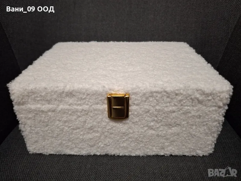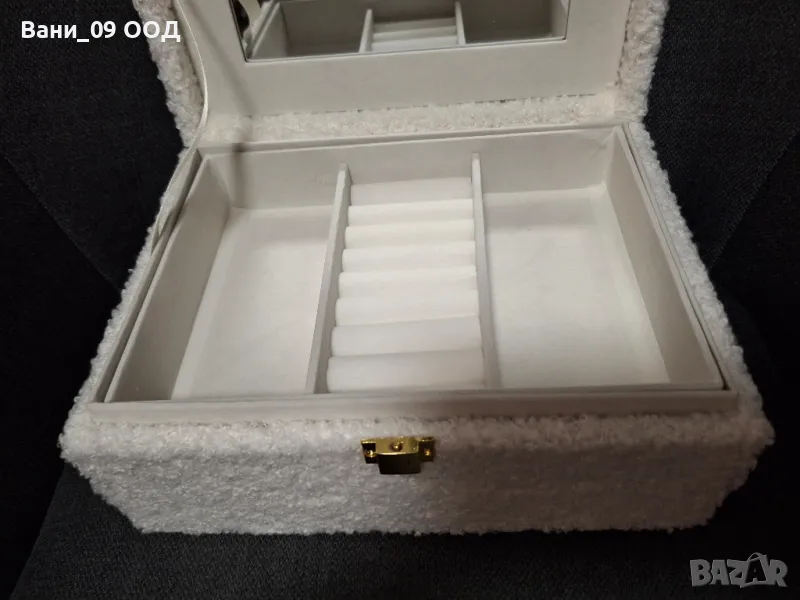 Красива кутия за бижута е бял плюш, разпределена на 2 нива. Горното ниво е разпределено на 3 сектора, като единия от тях е особени подходящ за пръстени.