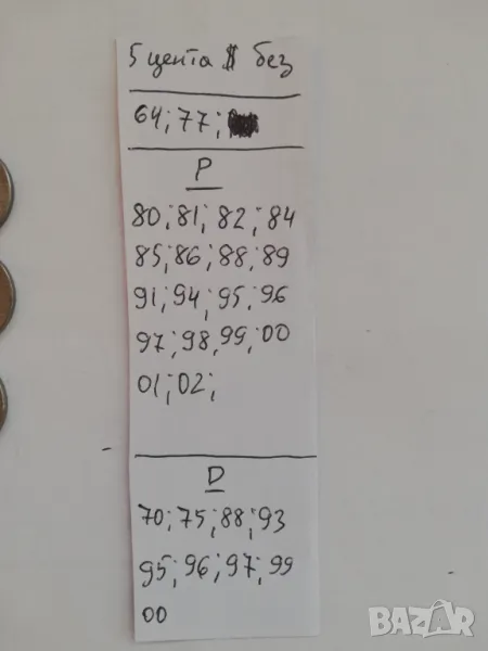 лот от 33 монети 5 цента Америка-USA различни години и с различни букви P;D от двете печатници в Денвър и Филаделфия.монетите са в прилично състояние за годините си и са както следва без буква-1964 и 77 г. с буква Р-1980;81;82;84;85;86;88;89;91;94;95;96;97;98;99;00;01;02 и 2007 г. и с буква D-1970;75;85;88;89;93;94;95;96;97;99 и 2000 г.цена за лота 17 евро.единични бройки по договаряне.изпращам само по еконт.всички описани монети са в наличност.