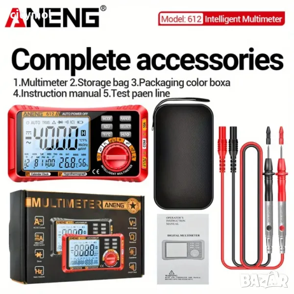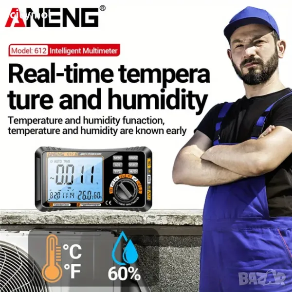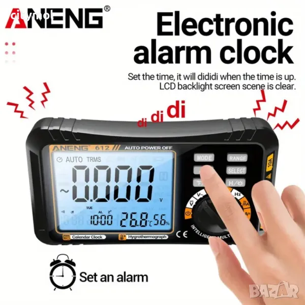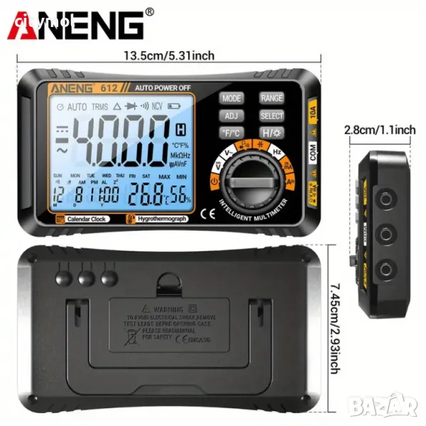 Цифров мултицет ANENG 612, AC/DC, ток, честота, съпротивление. С термохигрометър, календар, аларма