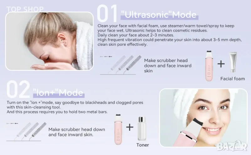 Режим ION+ (износ на йони): Дълбоко почистване и премахване на остарели кожички, черни точки, мъртва кожа, мазнини и замърсявания от грим и др.
