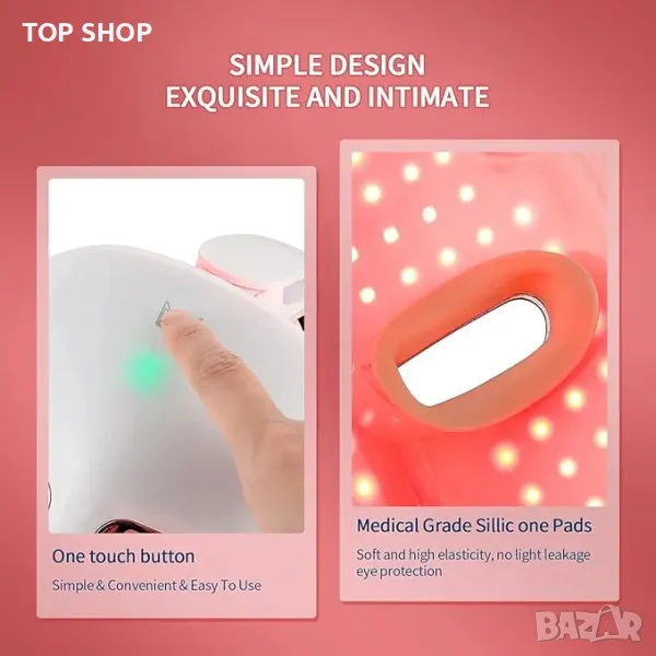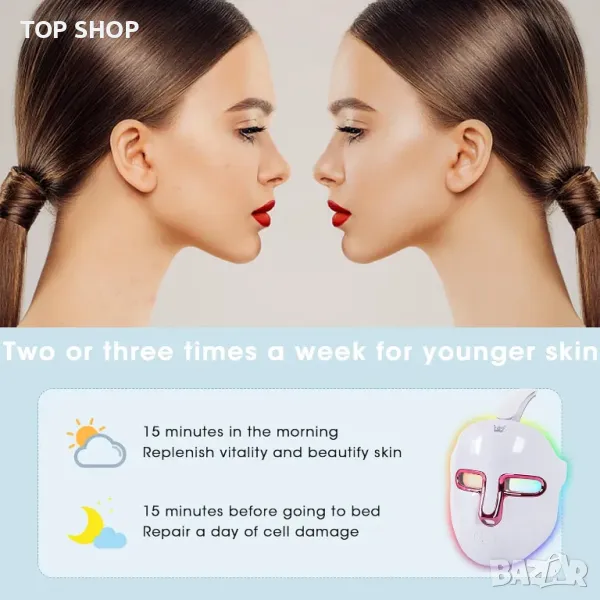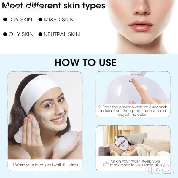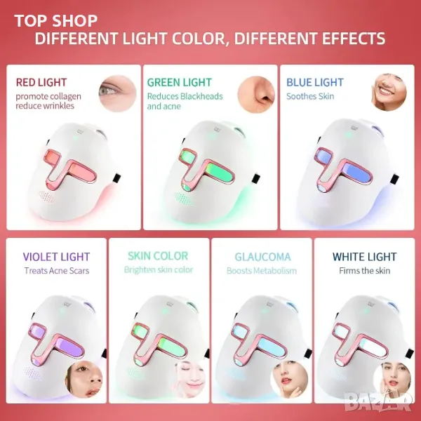 Червената светлина с дължина на вълната, центрирана на 635-644 nm, и инфрачервената светлина с дължина на вълната, центрирана на 845-855 nm, за лечение на бръчки по лицето. Синята светлина с дължини на вълните, центрирани на 430-445 nm, и червената светлина с дължини на вълните, центрирани на 635-644 nm за лечение на леко до умерено акне по лицето.