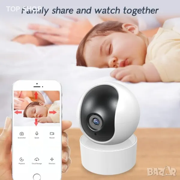 Двупосочно аудио и потребителско споделяне: В тази WiFi камера откриваме вграден микрофон и високопроизводителен високоговорител, който ви позволява да получавате звуци ясно и да утешавате нашето дете или домашен любимец, независимо къде се намираме. Също така имаме възможност да споделим видеоклипа с нашето семейство и приятели (максимум 6 души).