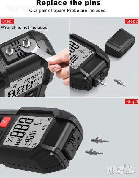 Пакетът включва: 1 x влагомер, 1 x ръководство за употреба, 1 x резервна сонда, 1 x чанта за съхранение, 3 x 1,5 V AAA батерии. Машината не може да се използва.