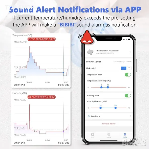 【Интелигентно ПРИЛОЖЕНИЕ с предупреждения】 Задайте диапазон на измерване на температура/влажност в APP и предупредителното известие ще бъде изпратено до телефона ви, когато температурата или влажността са извън предварително зададения диапазон, което ви позволява бързо да реагирате и да направите необходимите корекции.