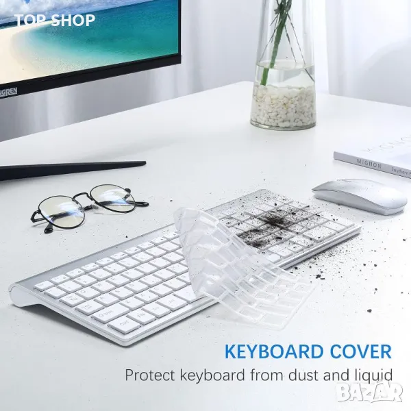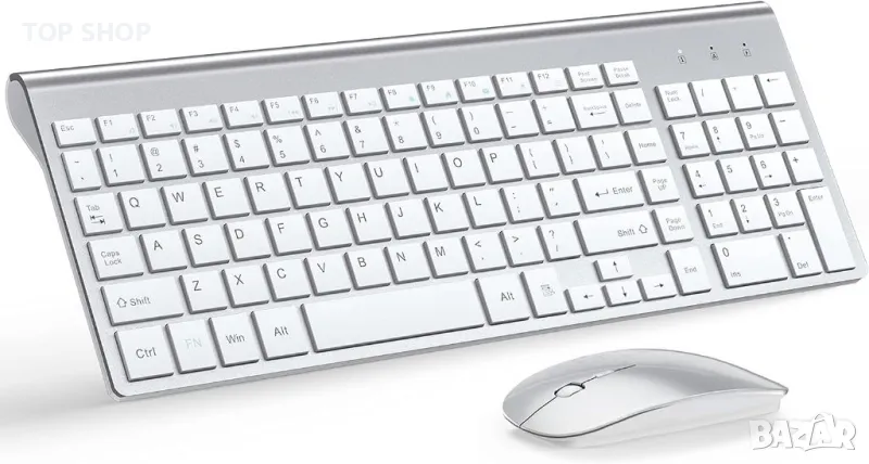 Безжична клавиатура и мишка TopMate Ultra Slim Combo, 2.4G безшумна компактна USB мишка и комплект клавиатура с ножичен превключвател с капак, 2 AA и 2 AAA батерии, за PC/лаптоп/Windows/Mac - сребристо бял