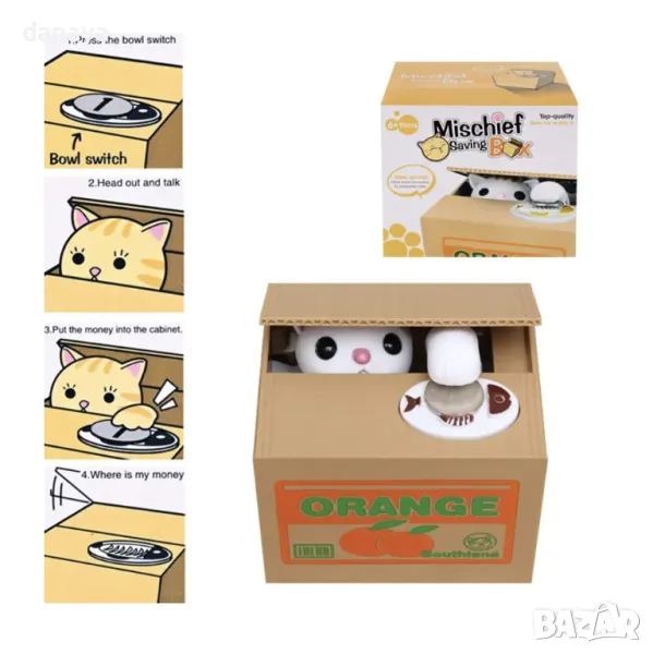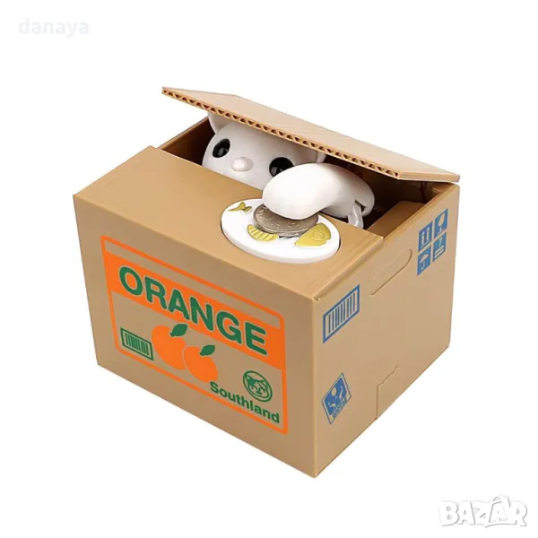 Касичката имитира кашон, в който е скрито малко мече панда или котенце. При поставяне на монета и натискане на бутончето, животинчето само отваря капака и прибира стотинката на сигурно място. Весела закачка, с която цалото семейство ще се забавлява. Поставете монетата на посоченото място и натиснете леко.