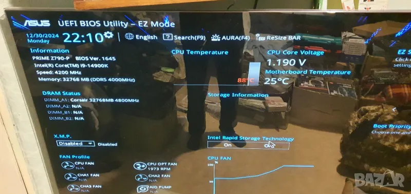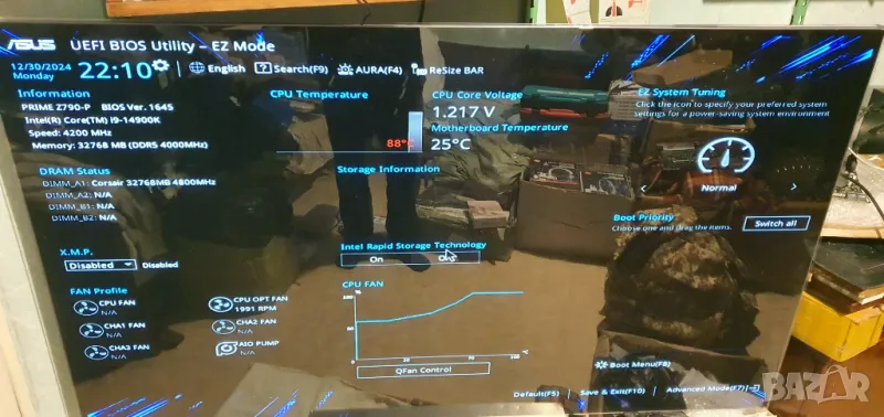 Свалена от работещ компютър. При изваждането на процесора се получиха няколко изкривени пина, който внимателно са поизравени. Прилагам снимки от сокета. След това е изпробвана още веднъж - всичките рам слотове, слот за видеокарта, слот за твърд диск SSD NVMe и всичко работи. Прилагам снимки от BIOS и давам 3 дена право на връщане. Мисля че е достатъчно за да се провери че работи стабилно.