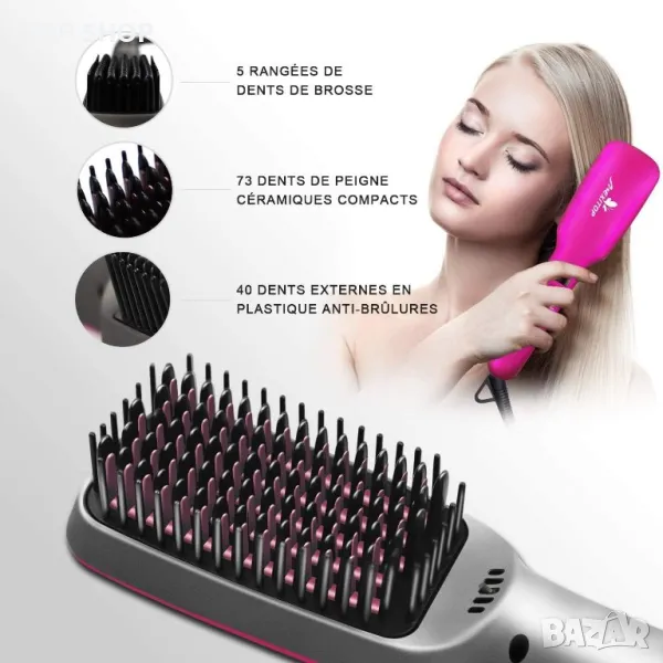 Добро работно изживяване Тази самонагряваща се четка за изправяне ви помага да се грижите за оформяне на коса или брада. Осигурява незабавна функция за изглаждане, като оставя косата здрава, блестяща, гладка и без къдрене. С генератора на йони, който може да поправи качеството на косата, кокът вече не е проблем. С тази четка можете лесно да получите красива коса вместо много скъп фризьорски салон.